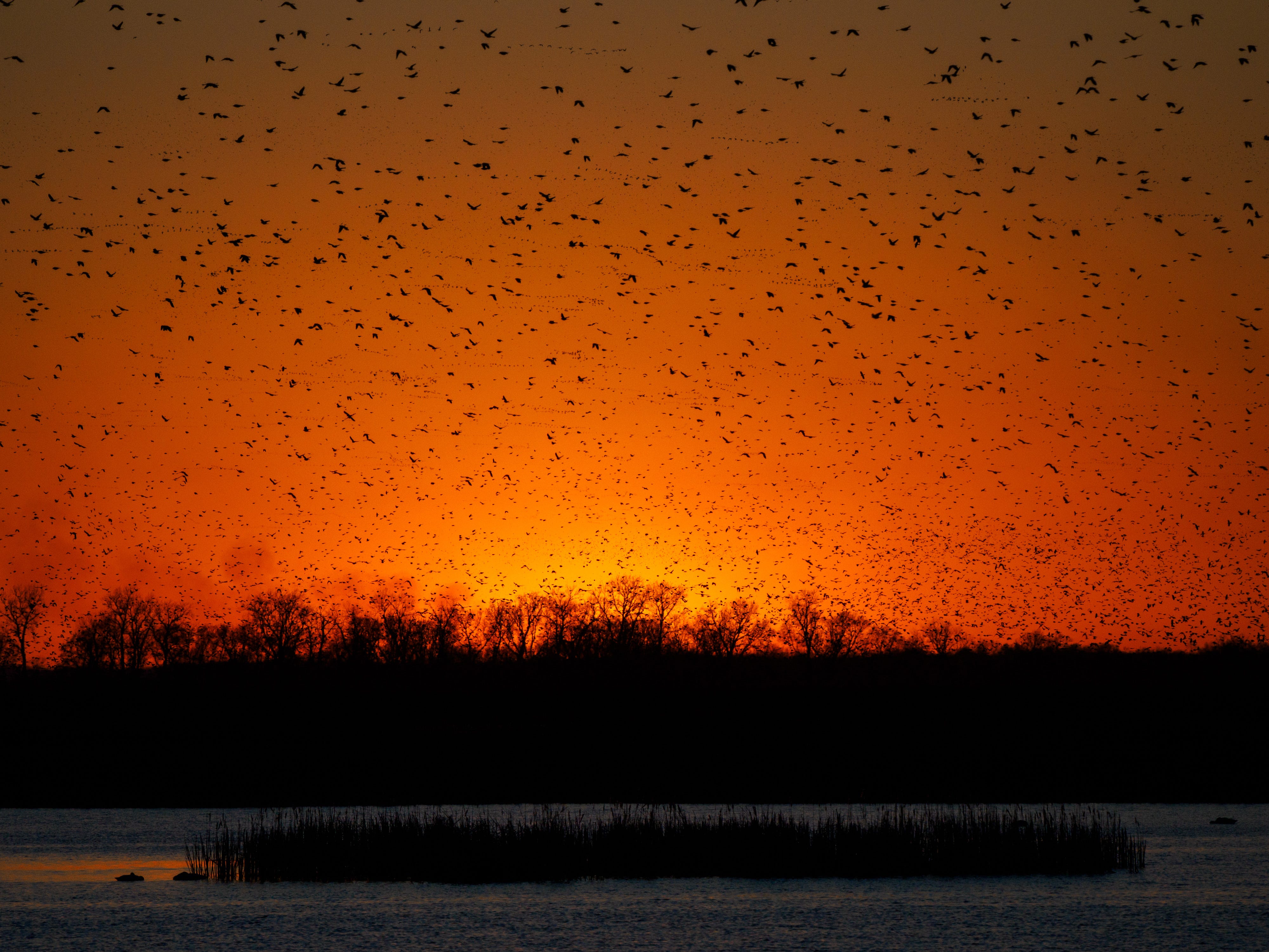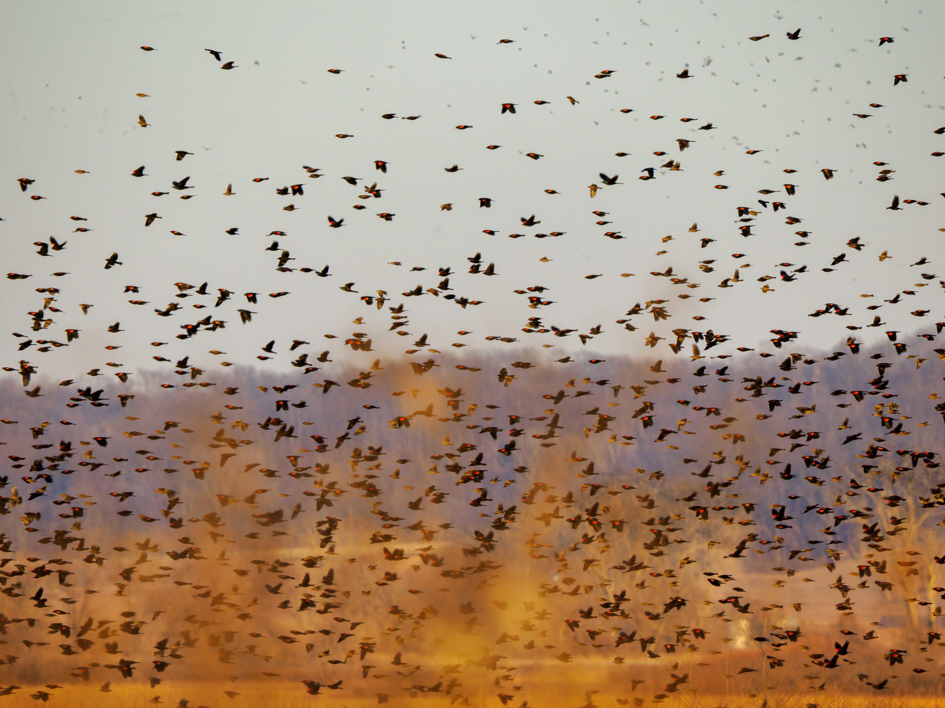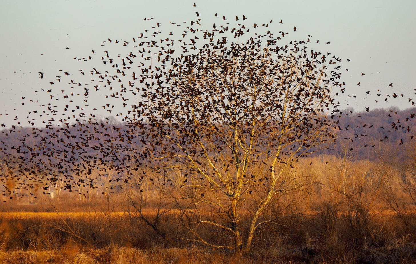 How can I convey the erratic, mesmerizing, chaotic gathering of red-winged blackbirds in the Loess Bluffs wetlands?