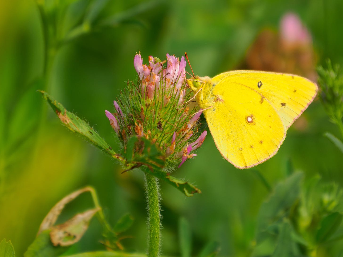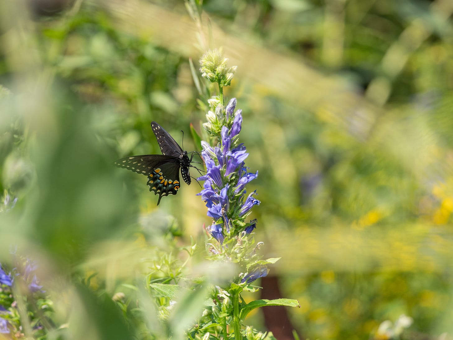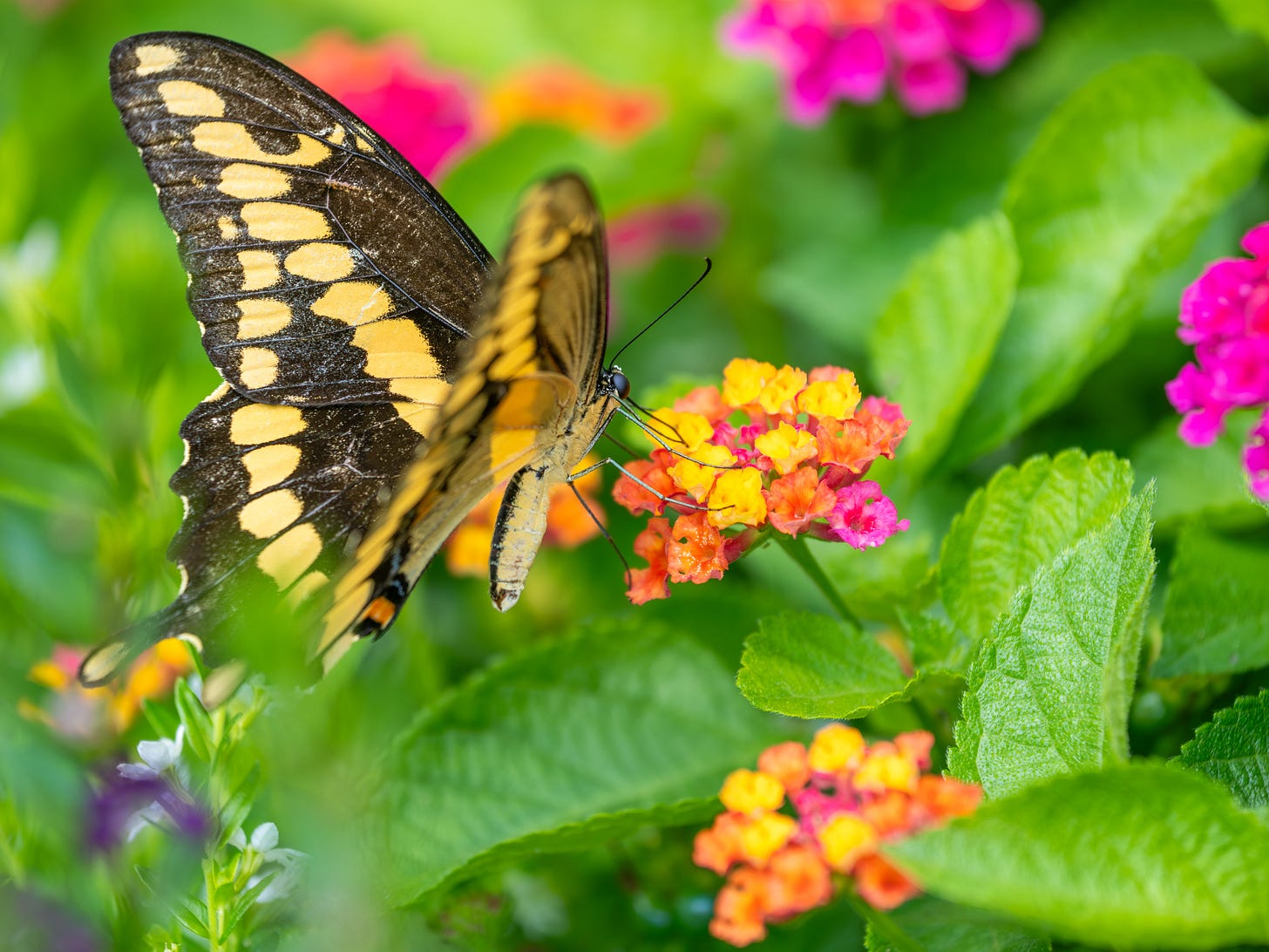 Then, I spot a stunning combination of yellow moths and purple flowers at my feet. With the OM-1 Mark II and MEGATRON (with the MC-20 attached) by my side, I can quickly capture these intimate details - all from the same spot.