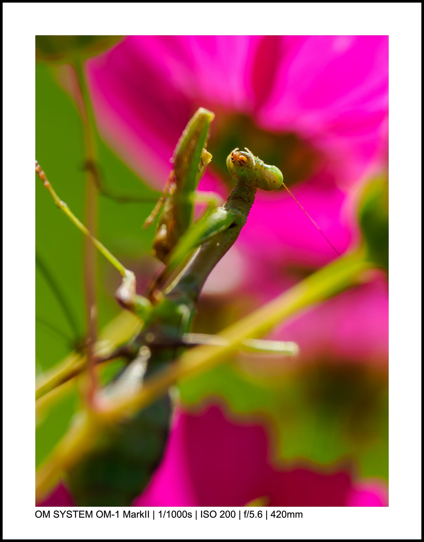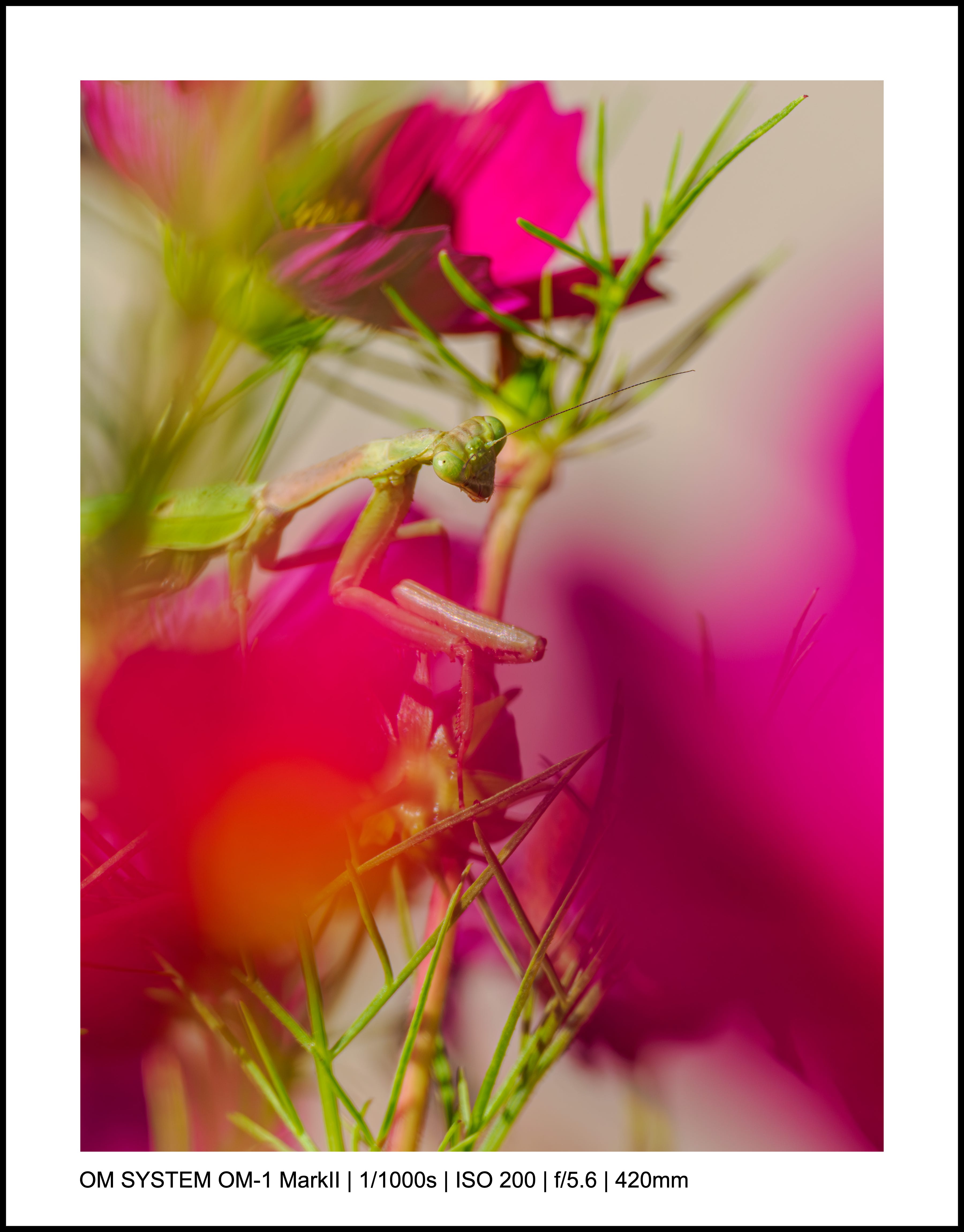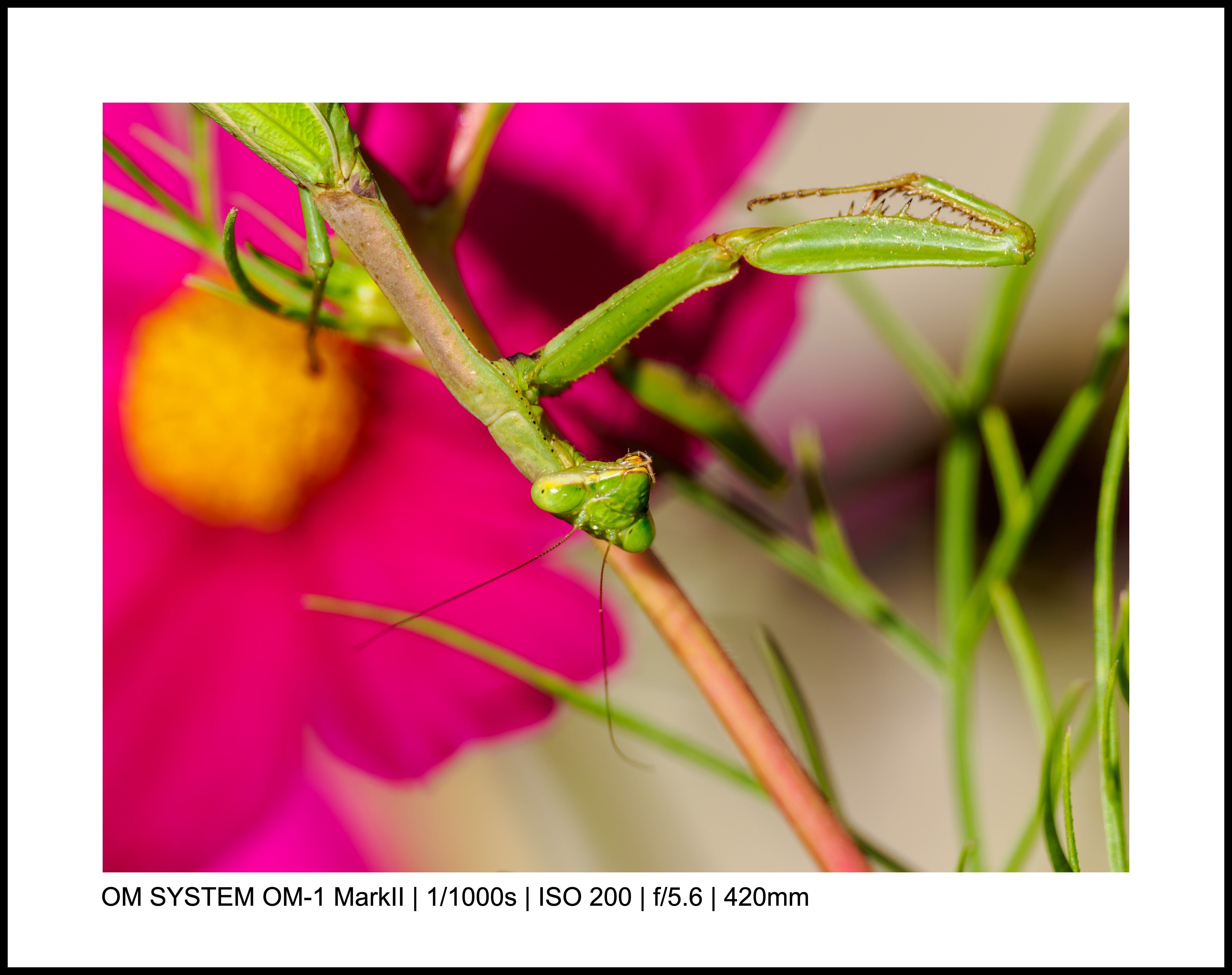 For the above photo, my OM-1 Mark II was on the ground, and I used the LCD screen to point the camera up toward the mantis.