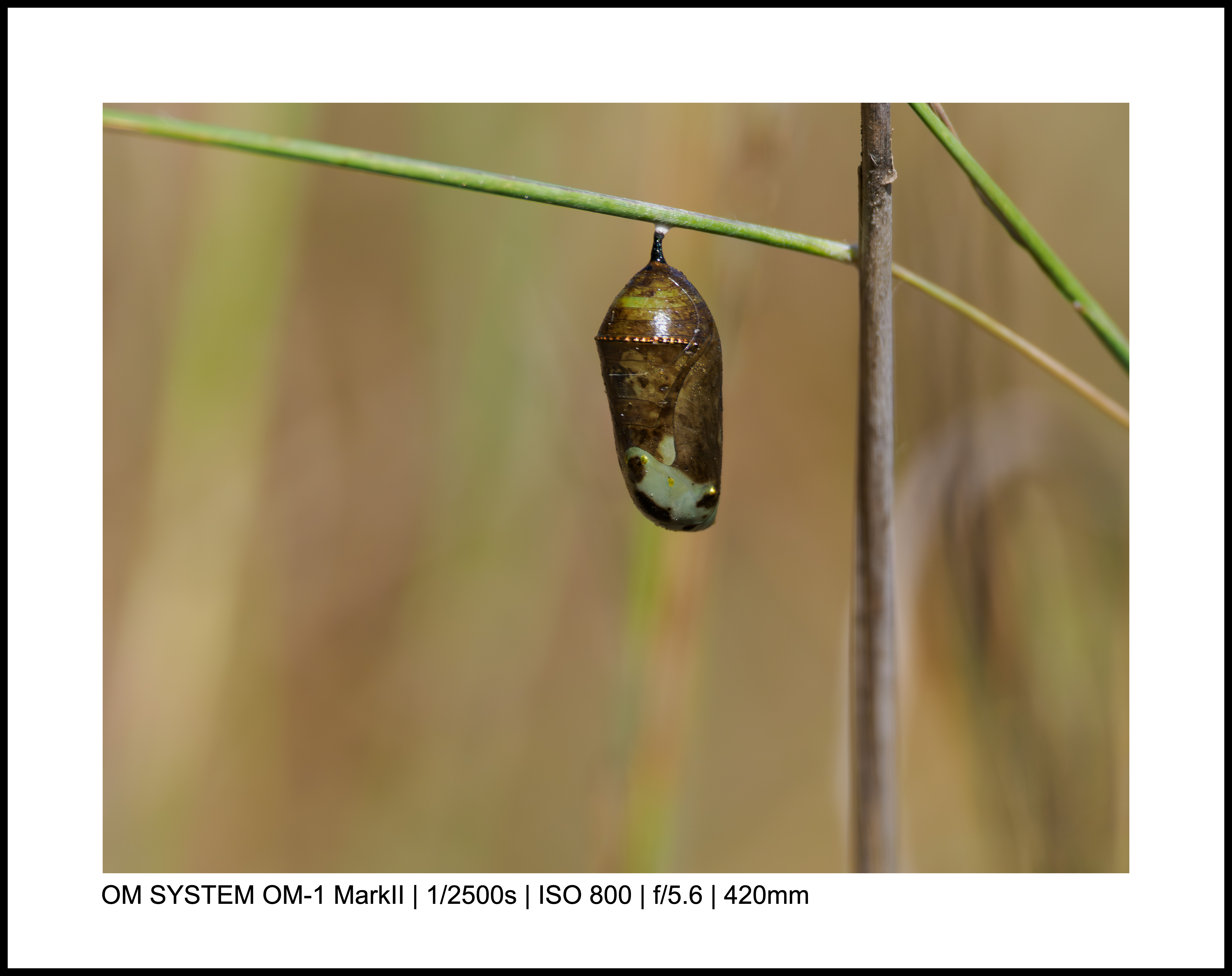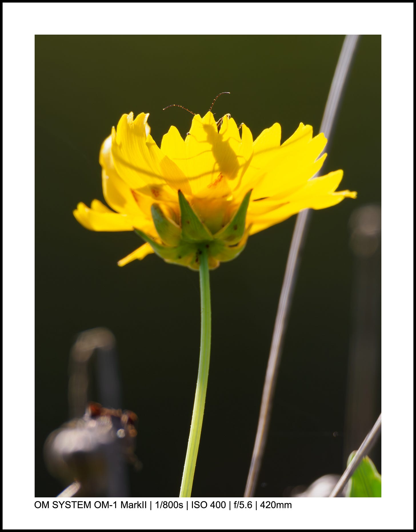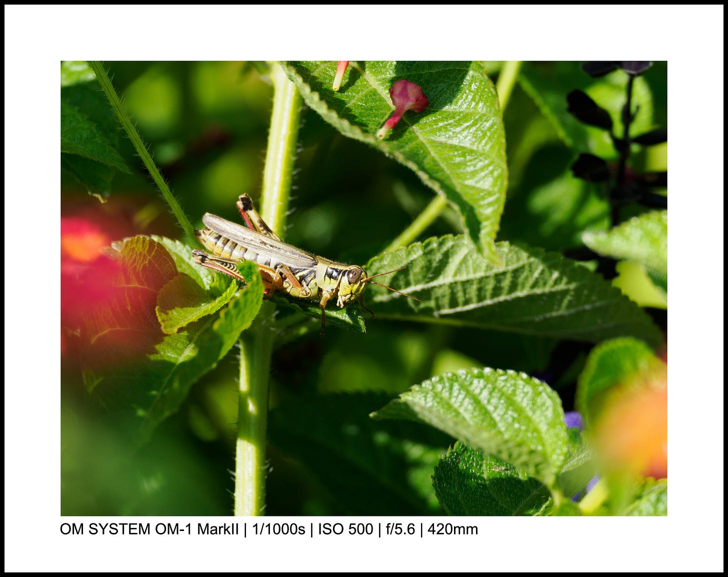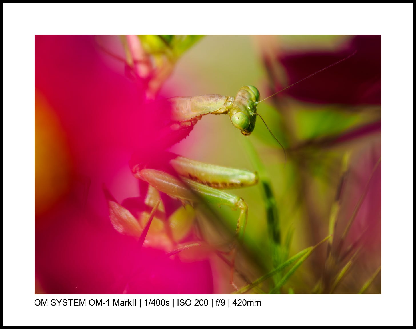 For the above photo, my OM-1 Mark II was on the ground, and I used the LCD screen to point the camera up toward the mantis.