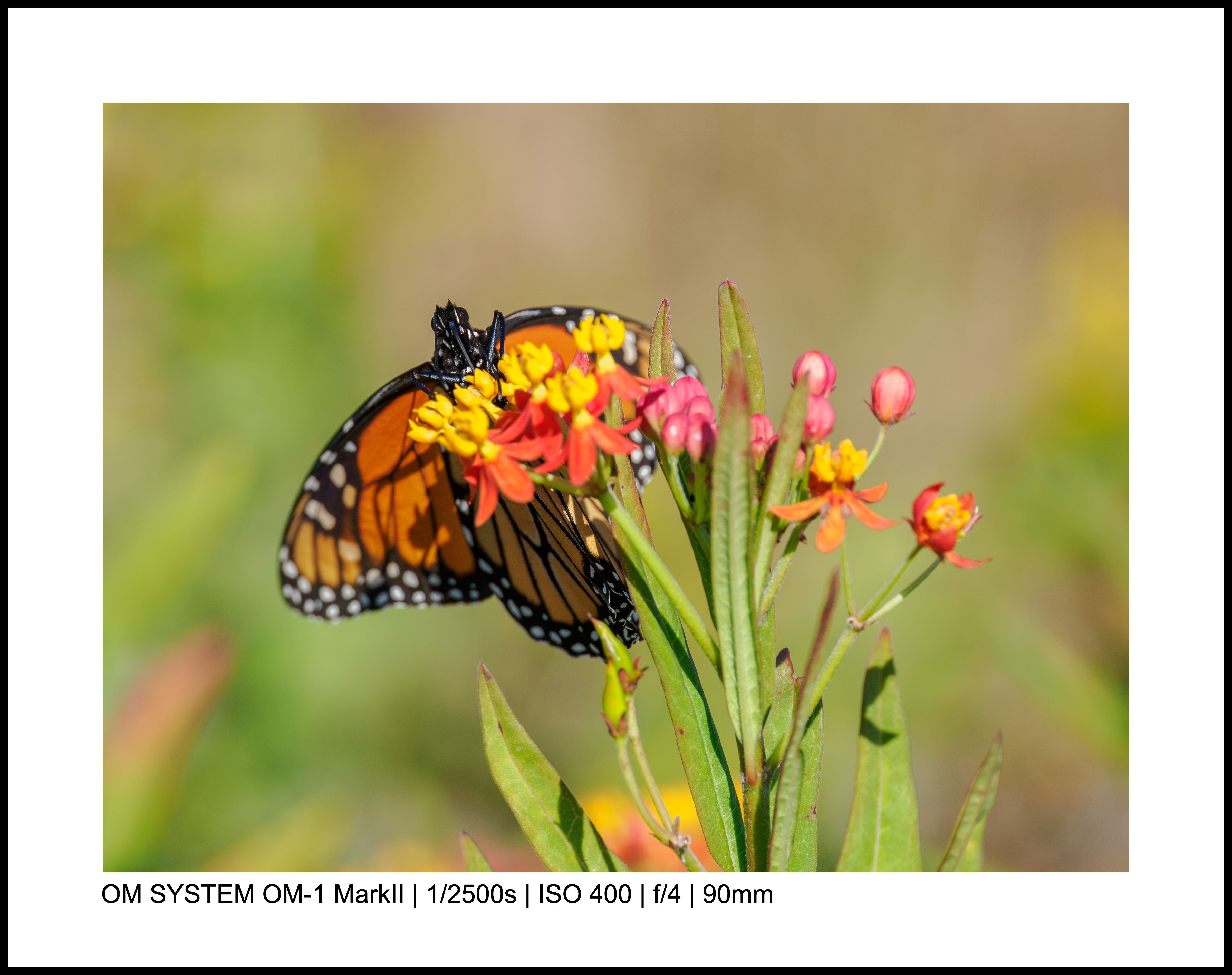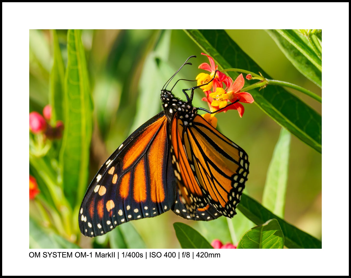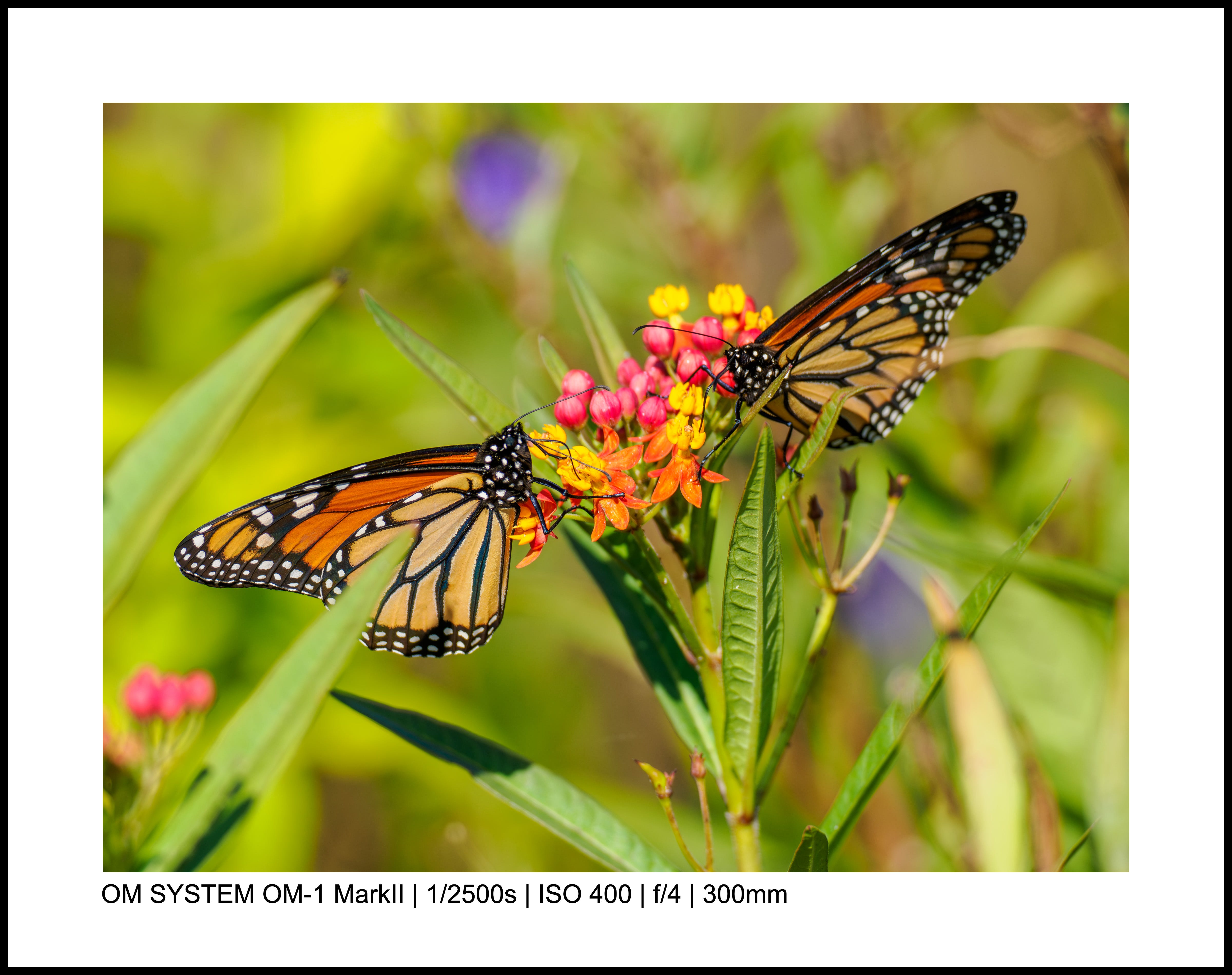 I’ve taken thousands of butterfly photos, but it’s not super common to get two on the same flower. Even better: these two monarchs seem almost mirrors of each other, and the colors just sing.