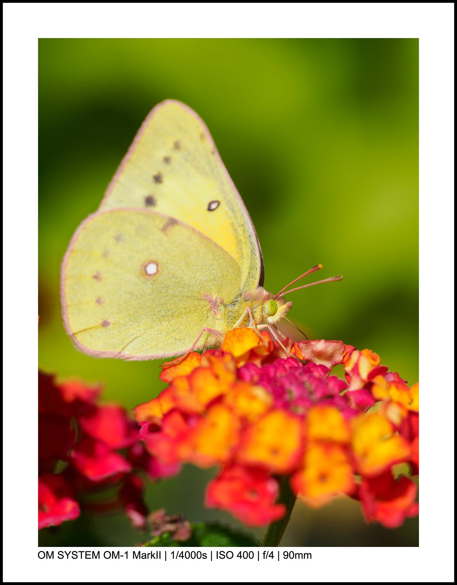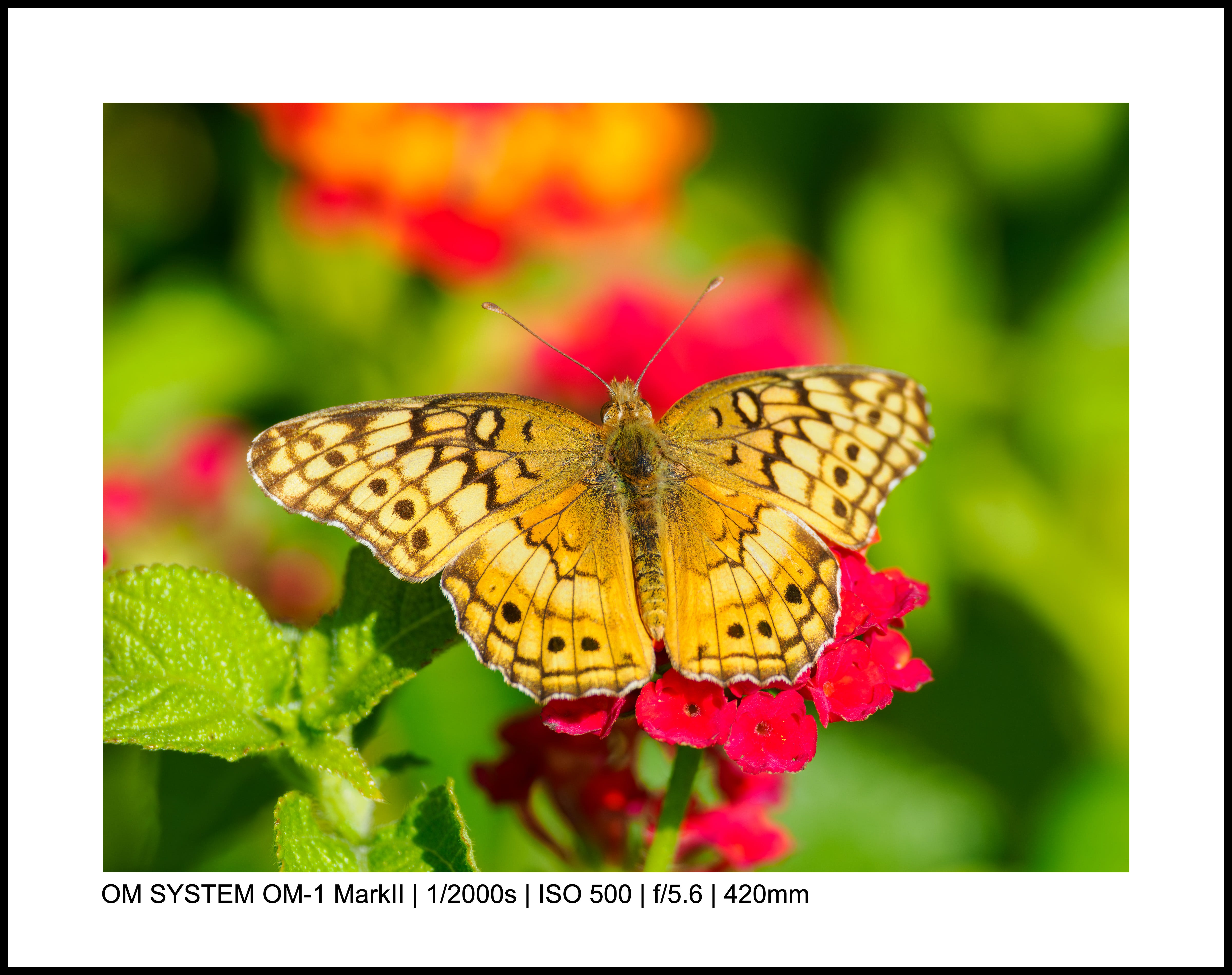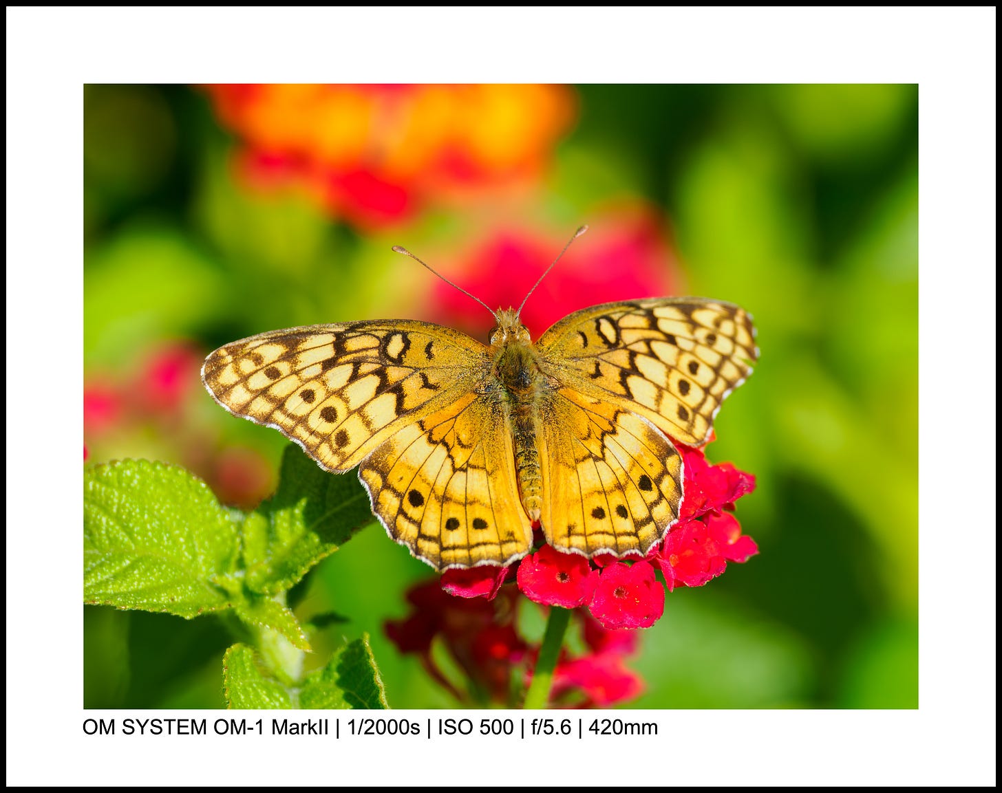 I’ve taken thousands of butterfly photos, but it’s not super common to get two on the same flower. Even better: these two monarchs seem almost mirrors of each other, and the colors just sing.
